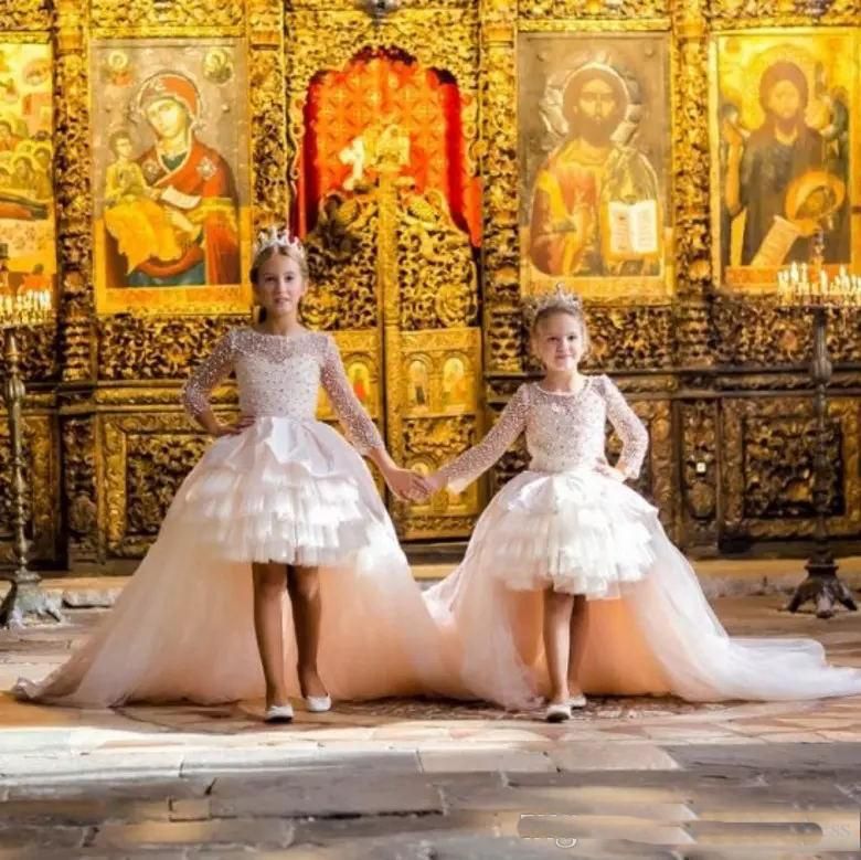2018 Luxury Beads Plearls Nude Ruffles Girls Pageant Dresses Long Sleeves Jewel Front Short Bac Long Prom Birthday Gowns